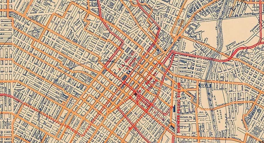 A final hint that Whitlock’s map was made not just to explain Los Angeles and its streetcars, but to celebrate them, is its size. At four feet high and three feet wide, it is not convenient for on-the-go navigation—even by 1919 standards. Its true purpose was likely proud display, a hypothesis additionally supported by the Los Angeles Map and Address Company, which, the Times reported, made “wall maps” with its unauthorized copy. What is more, every city street is named both on the map and in the index that occupies the bottom and right sides of the plan. Whitlock’s map, though certainly useful for wayfinding, gave Angelenos the added thrill of finding their home amidst the complexity—inviting them to visualize themselves as part of the city’s dynamic growth and prosperity.
