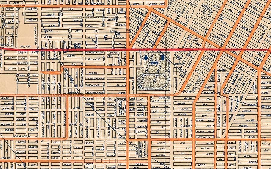 To say Whitlock was obsessed with detail is an understatement. Exposition Park is a small square on her map, yet she still locates the Natural History Museum, Expo Bloc, Armory, and the racetrack-turned-rose-garden within it.