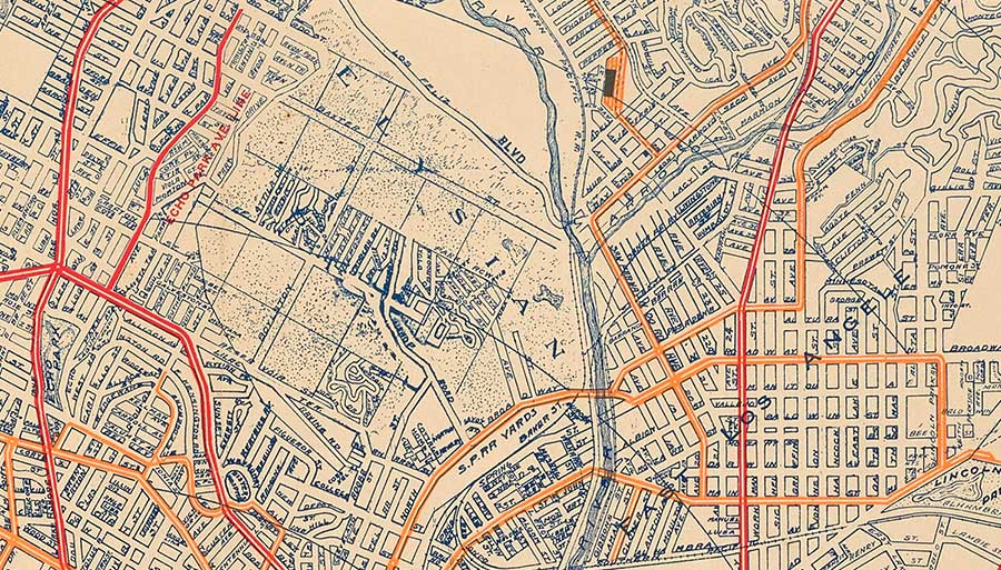 In the thick of Whitlock’s map, beneath the word “Elysian,” we get a valuable glimpse of the layout of Chavez Ravine, the neighborhood that existed before the valley was forcibly wrested from its Chicano owners to build Dodger Stadium in the 1950s.