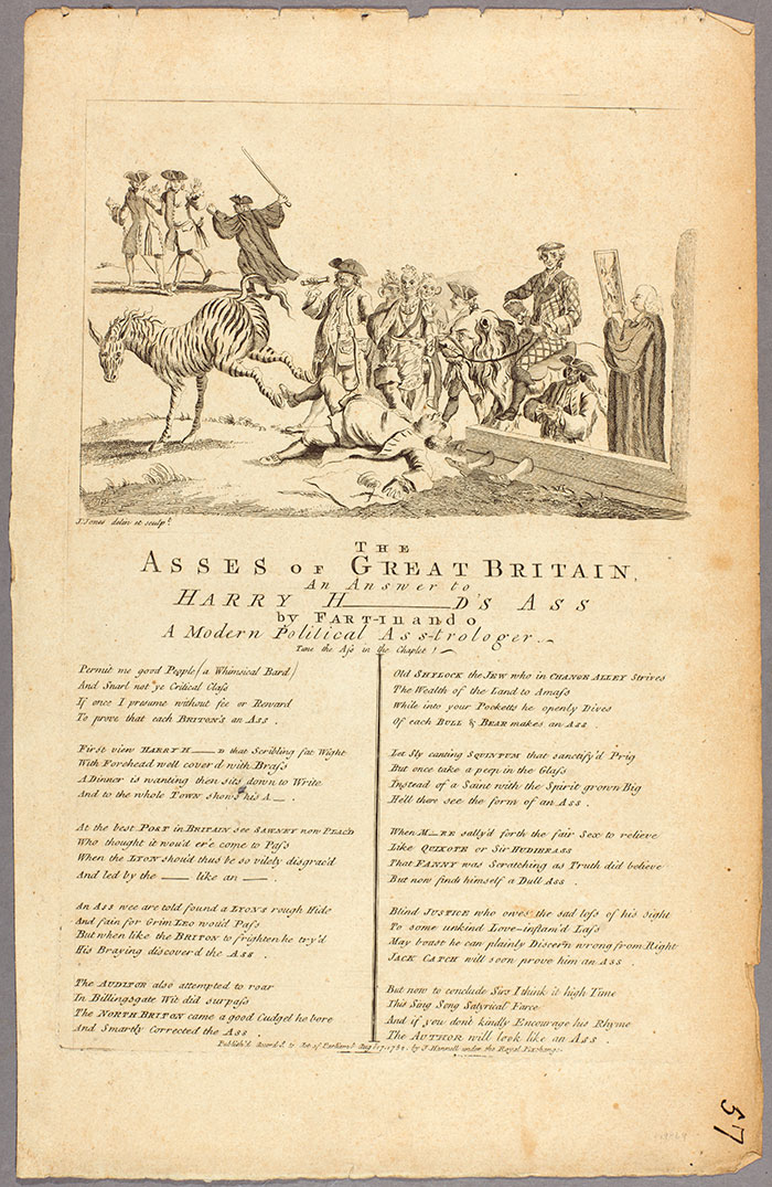 Dubbed the "Queen's she-ass," the zebra depicted by Stubbs became an instrument of satire in the hands of caricaturists, and rude songs about her appeared in broadsheets. The asses of Great Britain, an answer to Harry H----d's ass by fart-inando a modern political astrologer, 1762. The Huntington Library, Art Collections, and Botanical Gardens.