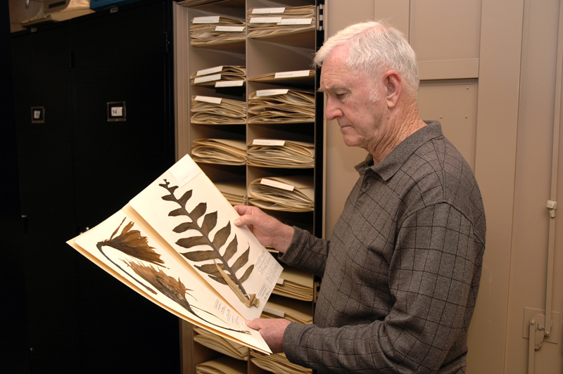 Myron Kimnach inspects a Huntington herbarium specimen of Epiphyllum chrysocardium. Photo by Lisa Blackburn, 2006.