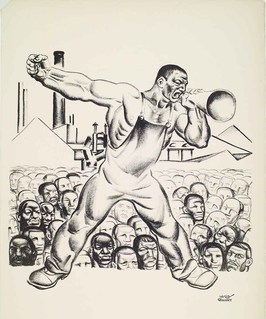 Gellert also became involved in editing and illustrating New Masses, a Communist publication. He and other artists from New Masses organized the John Reed Club, with the main goal of supporting Marxist writers and artists who believed that “Art is a weapon in the class struggle.” The club and its many local chapters disbanded in 1936, however, at the suggestion of the American Communist Party, which believed that the increasing power of fascist leaders abroad called for a club that could unify a broader spectrum of people under a larger banner than Communism. Out of this dissolution sprang the pan-ideological American Artists' Congress.