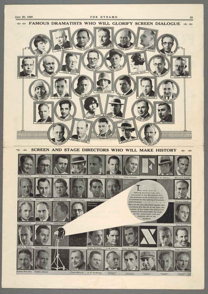 Promotional advertisement in the trade magazine 20th Century-Fox Dynamo, 1929. Located at the very center of a dazzling array of writers, from Booth Tarkington (two-time Pulitzer Prize–winning author of The Magnificent Ambersons) to Zoe Akins (Pulitzer Prize–winning dramatist of The Old Maid), Sonya Levien was one of five women among 28 men. Hired by Fox in 1929, Levien would work for the studio for 10 years, becoming one of its top and best-paid screenwriters. (The Huntington also holds the papers of Akins.) The Huntington Library, Art Museum, and Botanical Gardens.