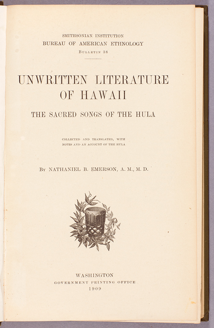 Title page of Emerson’s book Unwritten Literature of Hawaii: The Sacred Songs of the Hula, published by the Smithsonian Institution’s Bureau of American Ethnology in 1909. The Huntington Library, Art Collections, and Botanical Gardens.