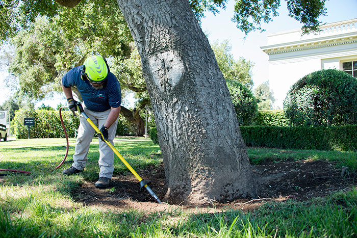 Huntington arborist Daniel Goyette uses an air spade to dislodge excess soil and expose the tree’s buttress roots. Photo by Kate Lain.