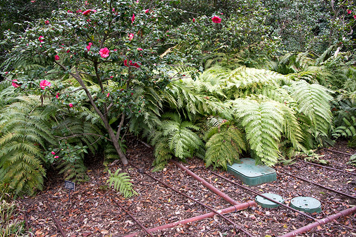 So a few years ago, MacLaren worked with his team and the irrigation crew to install approximately 20 miles of drip irrigation tubing in parallel lines under the camellias. The drip tubes release small amounts of water over time, allowing the moisture to reach deeper into the soil. Drip irrigation is also unaffected by local regulations that limit the duration of watering. The Huntington can run the drip irrigation for an extended period, provided the overall water-use stays below required levels.