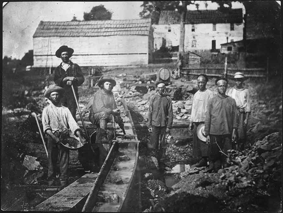 An 1852 photo taken at Auburn Ravine, located a little more than 30 miles northeast of Sacramento, shows both white and Chinese workers, prompting questions from Ngai that demonstrate how historians use archival materials to think about history. The image was clearly composed by the photographer. The whites are obviously miners, but what is the role of the Chinese? What is the relationship between the two groups? Were the Chinese part of a work gang, or did they work individually?