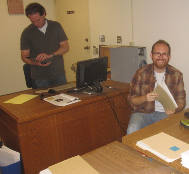 Erik Altenbernd (standing and holding a Turner family photo album) and Alex Young at work last year at The Huntington with the Turner papers.