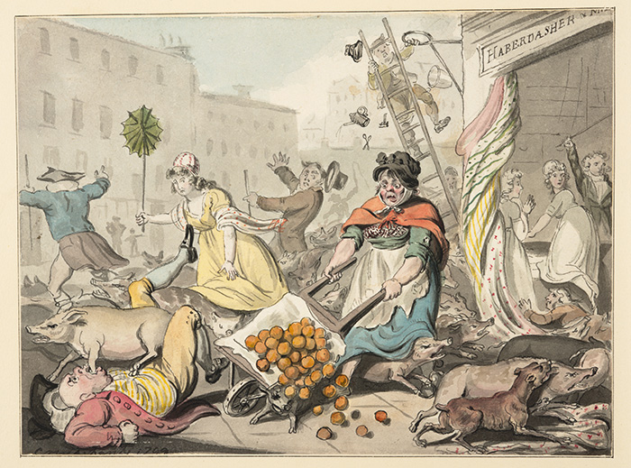 Isaac Cruikshank (British, 1764–1811), Unruly Pigs, 1799, pen and watercolor over pencil, The Huntington Library, Art Collections and Botanical Gardens.