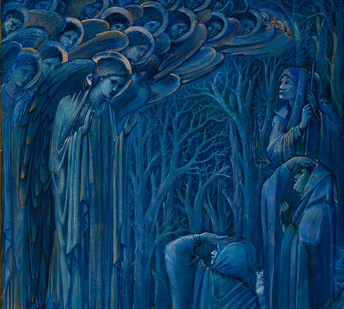 Artist Edward Burne-Jones (1833–1898) rendered this work—which measures almost five feet high—in various dreamy shades of blue offset with touches of gold. The elongated scene is divided into two sections by a swooping “S” curve, reminiscent of historiated letters in manuscript illuminations. In the upper portion of the painting, a crowd of angels appears before shepherds, who shield their eyes from the dazzling vision. The background is filled with a tangle of skeletal trees. In the lower portion of the painting, Mary, Joseph, and a small group of angels gaze at the infant Jesus in wonderment. Here the artist painted a cave in the background, creating a sense of protection and quiet piety that contrasts with the decorative brilliance above.