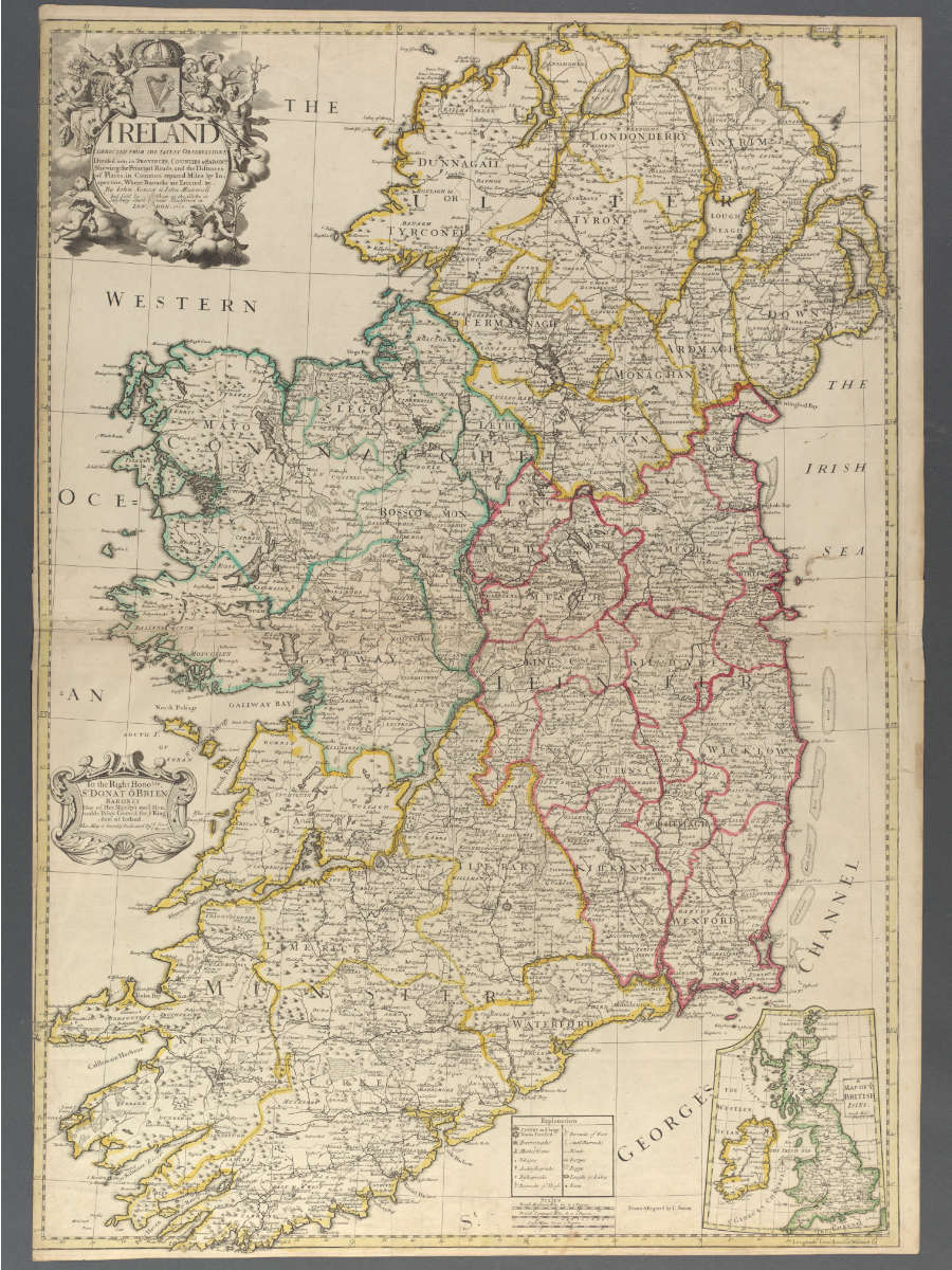 Ireland: corrected from the latest observations divided into its provinces, counties & baronies shewing the principal roads and the distances of places, in common reputed miles, by inspection, where barracks are erected &c / by John Senex & John Maxwell and sold by them at the Globe in Salisbury-Court near Fleetstreet in London, London, 1712. The Huntington Library, Art Museum, and Botanical Gardens.