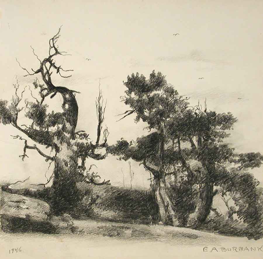 E. A. Burbank, Group of Trees, graphite on paper, 1946, 10 1/16 x 10 1/8 in. (25.6 x 25.7 cm.), Gift of Mrs. Adelaide Bray. The Huntington Library, Art Museum, and Botanical Gardens.