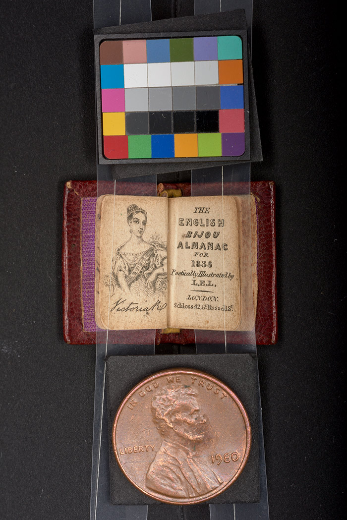 The English Bijou Almanac of 1837. Published by Albert Schloss. Photographing a volume of this size poses unique challenges. In order to take professional images of this and other miniature volumes, Huntington staff constructed a small cardboard stand and used a system of clear strips and conservation thread to hold the volume partly open. The Huntington Library, Art Collections, and Botanical Gardens.