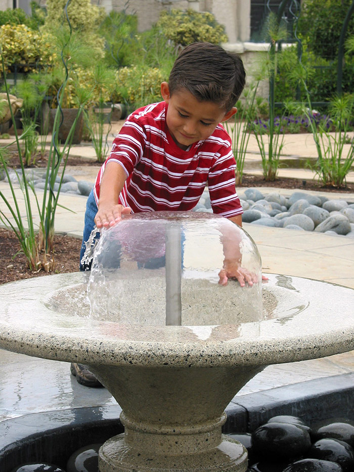 Water is one of four elements of nature represented in the interactive features in the Children’s Garden, along with Fire, Earth, and Air. Children can use their hands to change the shapes of water bells, thereby altering the flow of the water.