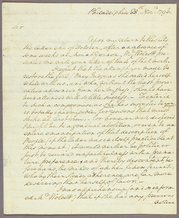 George Washington’s letter to Joseph Whipple regarding the runaway slave Ona Maria Judge, Nov. 28, 1796. In the second paragraph, Washington writes: “I regret that the attempt you made to restore the girl (Oney Judge as she called herself while with us, and who, without the least provocation absconded from her Mistress) should have been attended with so little success. To enter into such a compromise, as she has suggested to you, is totally inadmissible, for reasons that must strike at first view: for however well disposed I might be to a gradual abolition, or even to an entire emancipation of that description of People (if the latter was in itself practicable at this Moment) it would neither be politic or just, to reward unfaithfulness with a premature preference; and thereby discontent, beforehand, the minds of all her fellow Servants; who by their steady adherence, are far more deserving than herself, of favor.” The Huntington Library, Art Collections, and Botanical Gardens.