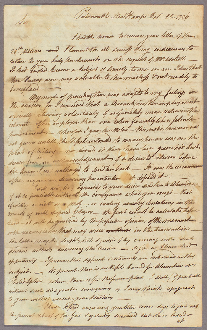 Letter from Joseph Whipple to George Washington, Dec. 22, 1796. In his second sentence, Whipple writes: “I sincerely Lament the ill success of my endeavours to restore to your Lady her servant on the request of Mr Wolcott—It had indeed become a subject of Anxiety to me on an Idea that her services were very valuable to her mistress and not readily to be replaced.” The Huntington Library, Art Collections, and Botanical Gardens.