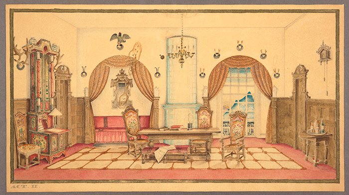 The second act takes place in a hotel in Switzerland. Nielsen’s design makes clear the resort locale, equipping the room with antlers, steins, a cuckoo clock, and distant mountain peaks that appear in the single window. His meticulous brushwork crafts the embroidery on the chairs, the scroll patterns on the curtain, and carved accents on the wood paneling.