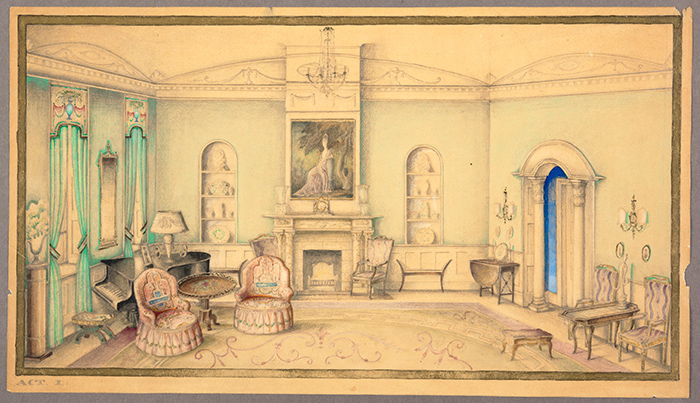 The highlight of The Huntington’s Nielsen holdings is a set of watercolor illustrations for stage sets, produced in preparation for Akins’ stage adaptation of W. Somerset Maugham’s 1930 short story The Human Element. Charting the foibles of the human heart, The Human Element tells the tale of a socialite (the daughter of an English duke) and her admirers, and reveals a secret love between the daughter and a household servant.