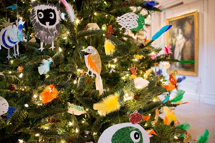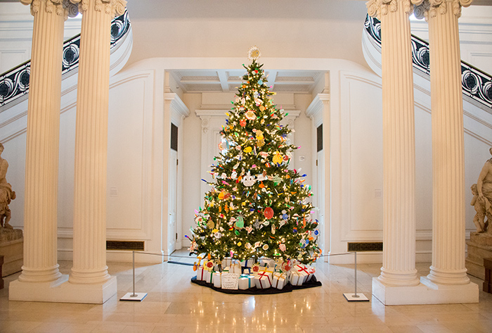 Turns out the sound was a unique and astonishingly lifelike bird call that security officer Rachel Yates is able to make. Hess quickly rustled up the staff necessary to record and amplify the sound, and . . . voila! The annual designer tree was complete.