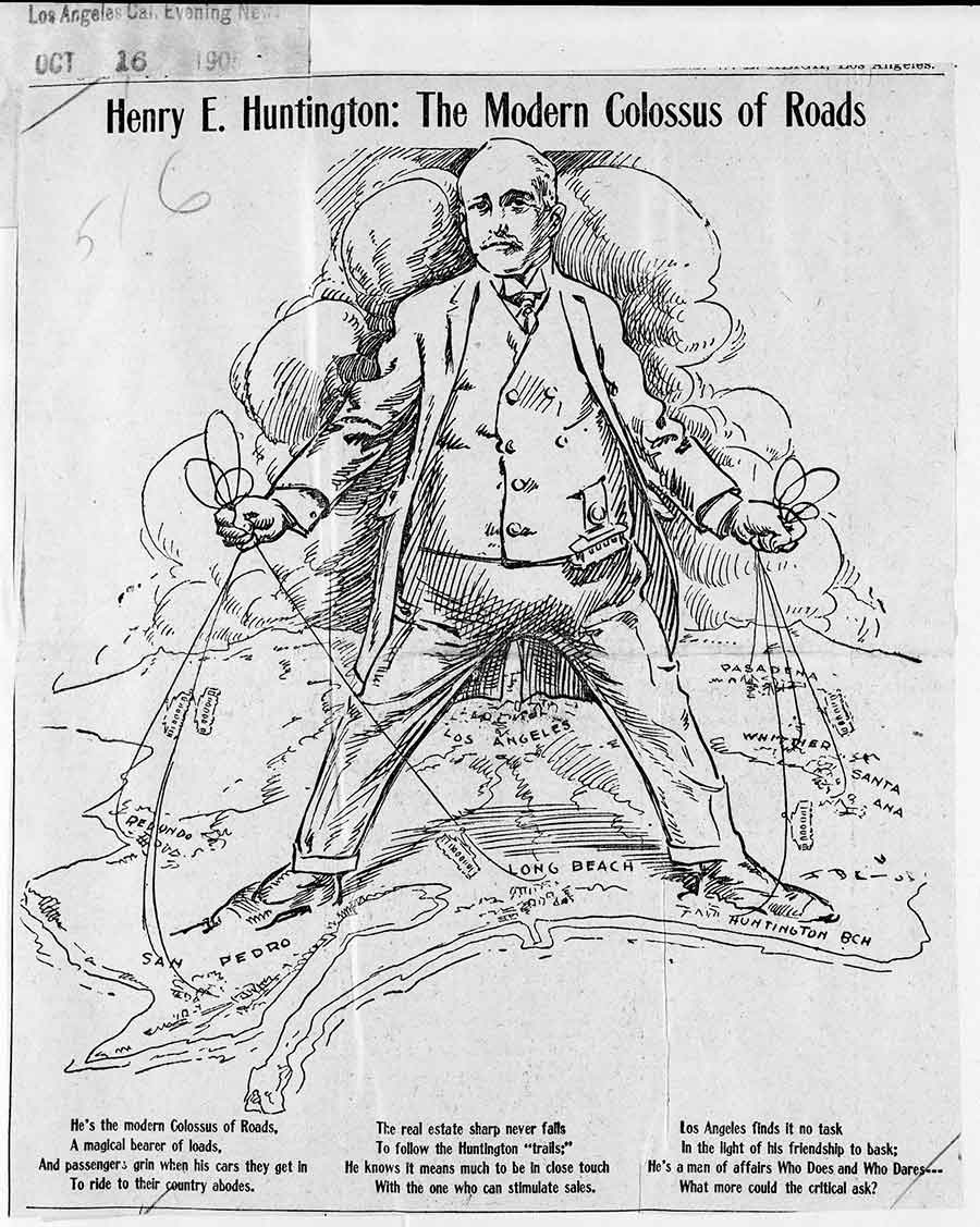 A cartoon of Henry E. Huntington as “The Modern Colossus of Roads,” Los Angeles Evening News, Oct. 16, 1905. The Huntington Library, Art Collections, and Botanical Gardens.