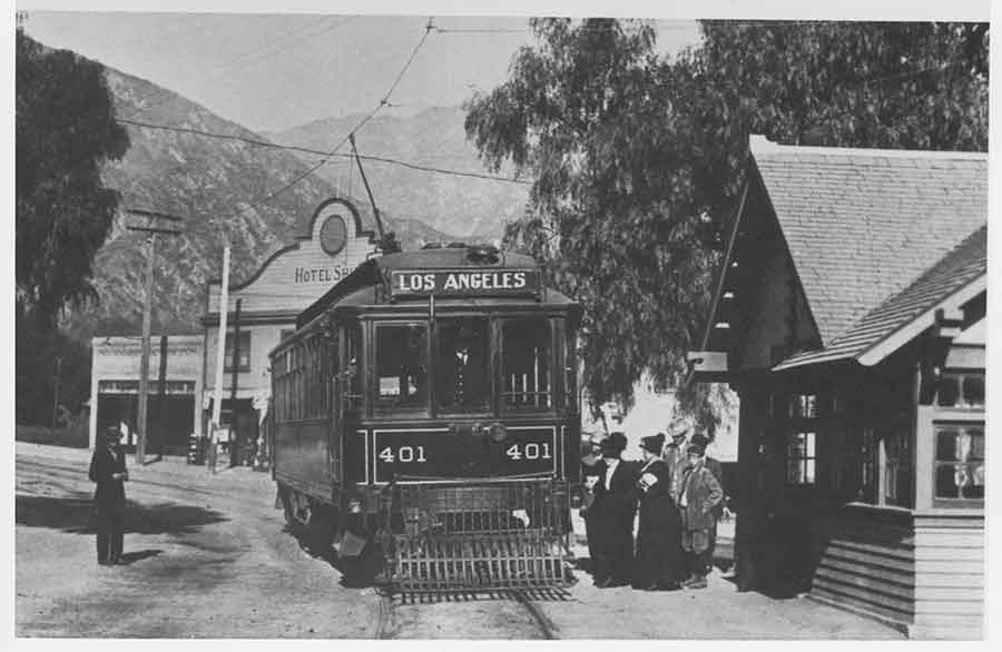 Sierra Madre Red Line station on Baldwin Avenue, Sierra Madre, California, 1906. The Los Angeles streetcar system totaled 1,140 miles in 1910, which is a third larger than today’s New York City subway system. It was one of the largest privately funded interurban systems ever built. The Observatories of the Carnegie Institution for Science Collection at the Huntington Library, San Marino, California
