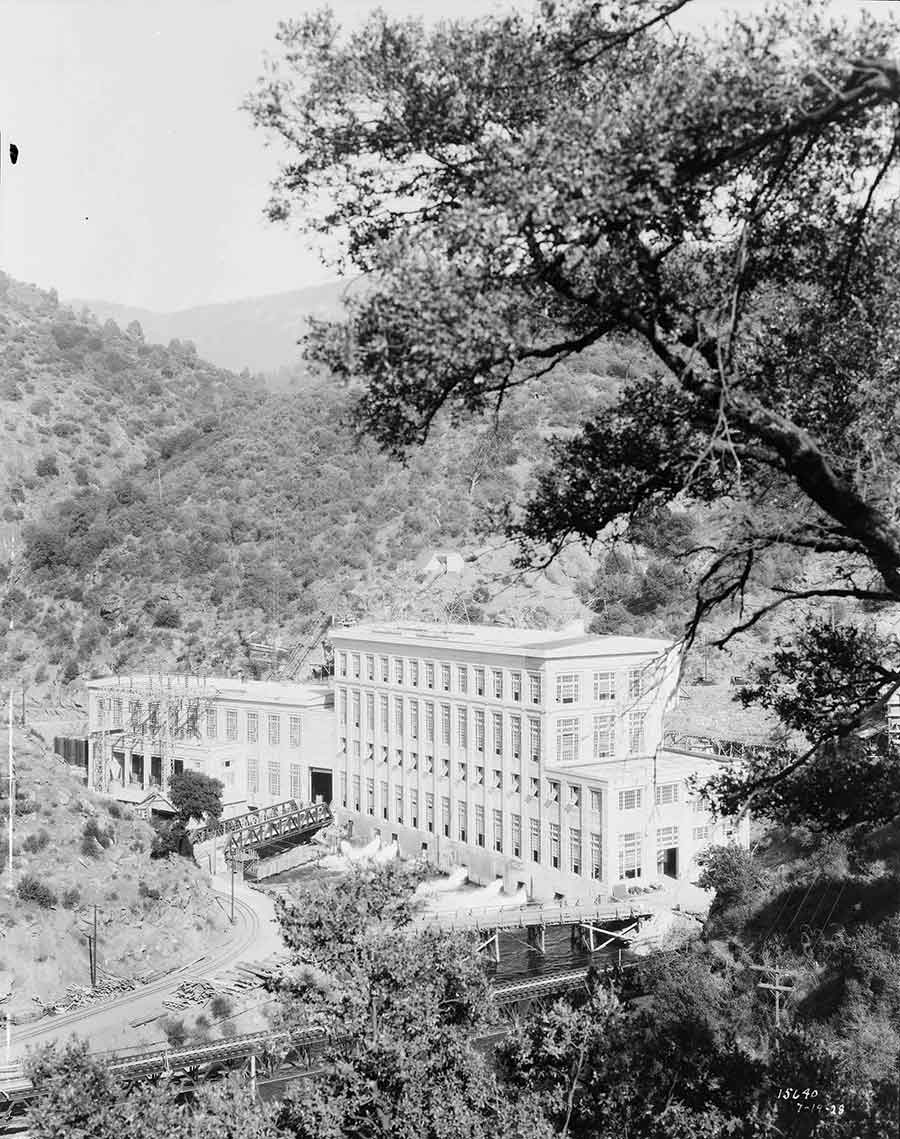 The Big Creek powerhouse, as it appeared on July 19, 1928. The Huntington Library, Art Collections, and Botanical Gardens.