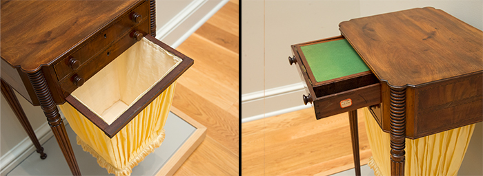 Left: Opening to a reconstruction of a 19th-century silk pouch that would have held needleworks in progress. Right: A writing tablet covered with green baize. Lady’s Work Table, ca. 1810. Unknown maker, American. Mahogany, mahogany veneer, and Eastern White pine, with silk sewing bag. Gift of Dr. Arthur Bond Cecil and Mrs. Henrietta Smith Cecil. The Huntington Library, Art Collections, and Botanical Gardens. Photos by Kate Lain.