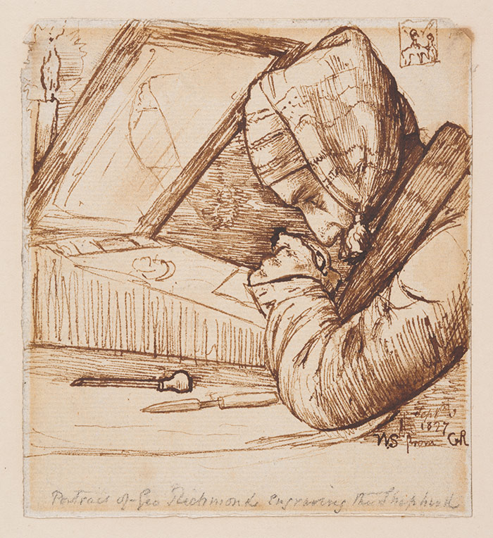 George Richmond was himself a successful portraitist, but he is the one pictured in a drawing by his close friend Samuel Palmer. Palmer shows the hardworking Richmond laboring over a print, his engravers’ tools near to hand, figure hunched over in deep concentration. The portrait is both a behind-the-scenes view of the creative process and a testament to the artists’ friendship.