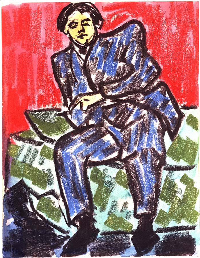 Another instance of artistic camaraderie is celebrated in Henri Gaudier-Brzeska’s portrait of illustrator and designer Claud Lovat Fraser. In the bright colors and bold lines of his modernist style, Gaudier-Brzeska playfully captures his friend’s famously portly figure, complete with double chin. Leaning back on one elbow, the debonair Fraser appears content and relaxed, caught in a moment of casual conversation.