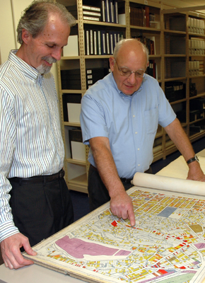 Alan Jutzi (right), chief curator of rare books, and colleague David Mihaly look at one of the L.A. city maps used by researchers developing the video game project. Photo by Lisa Blackburn.