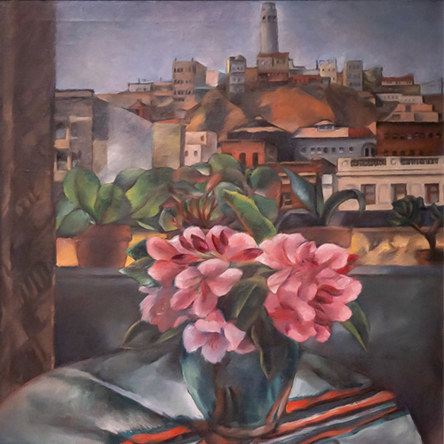 Miki Hayakawa’s From My Window—on loan from the collection of Sandra and Bram Dijkstra in The Huntington’s Virginia Steele Scott Galleries of American Art—captures a specific place and time. Hayakawa (1899–1953) painted this view from her home near the northeastern corner of San Francisco, just a few blocks from Telegraph Hill, in 1935. At the center of the canvas is a vase filled to its brim with bright pink blooms, some drooping and some still waiting to open. The vase sits on a vibrantly striped tablecloth, near a checkered brown curtain pulled back to reveal the buildings dotting the hill—at the top of which stands the imposing Coit Tower. A still life that denotes an exact dot on the map, this painting is a window into the movements and displacements of Hayakawa’s life as an Asian American woman and modernist painter in pre–World War II California.