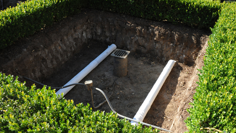 With that being the case, our buildings are happy indeed—which pretty much explains why the lemon trees in the Richards Family Courtyard at the Botanical Center have never really prospered. In desperation, we sacked out the lemons and decided to increase the drainage by digging deeper. But even after hauling out three feet of soil, the going was still hard. So we ran a drainage trial. Filling one of the holes up to a piece of red brick that was visible in the compacted soil, we let things stand for a day, then another, then a third. After all this time, the water level dropped by less than an inch. There was, essentially, no drainage.