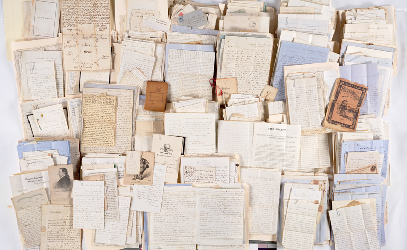 Gina and I keep track of it all on catalog cards. Unlike a rare book or reference volume, manuscripts do not have an easy place for a barcode. While the manuscript department does house thousands of volumes, there are vast collections composed of hundreds of boxes, each box containing hundreds of letters. Such a collection would need a master barcode. Then each box would need its own barcode, and each letter within each box. It is a nice dream, and a dream that will, one day, become reality. Until that day, however, we use the same manual card-based checkout system (complete with date stamp!) that has been in practice since the 1920s.
