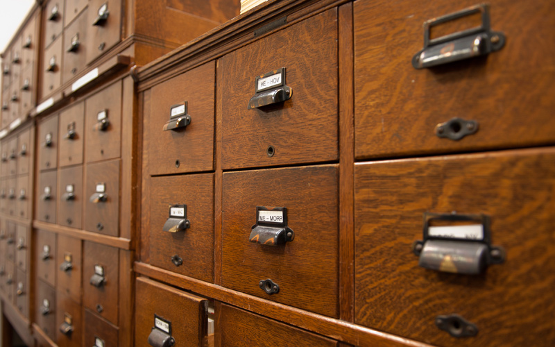 Staff members still rely on the card catalog, a tried and true method for organizing the manuscript collections for quick retrieval. Photo by Martha Benedict.