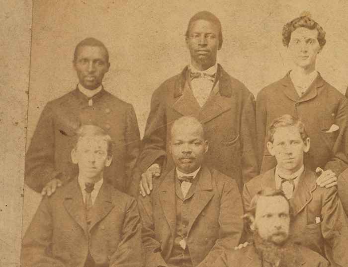 All this research raised more questions than answers. How did Judge Underwood choose these men? And who were they? A few identities came into focus. Lewis Lindsay (seated and holding a scroll in the image above) was a fearless advocate for the confiscation of Confederate lands. Born enslaved in Virginia, Lindsay worked at a Richmond iron works after the war. Albert Royal Brooks (seated second from left in the image above) purchased his and his family’s freedom between 1861 and 1865, and became a respected Richmond businessman and community leader. Joseph Cox (standing far left in the image below) was a free Black man employed as a factory worker, blacksmith, bartender, and storeowner during his lifetime.