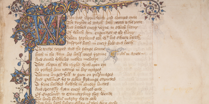 The opening page of the Ellesmere manuscript of Geoffrey Chaucer's "Canterbury Tales," 1400–1405, written in a scribe's careful penmanship. The Huntington Library, Art Collections, and Botanical Gardens.