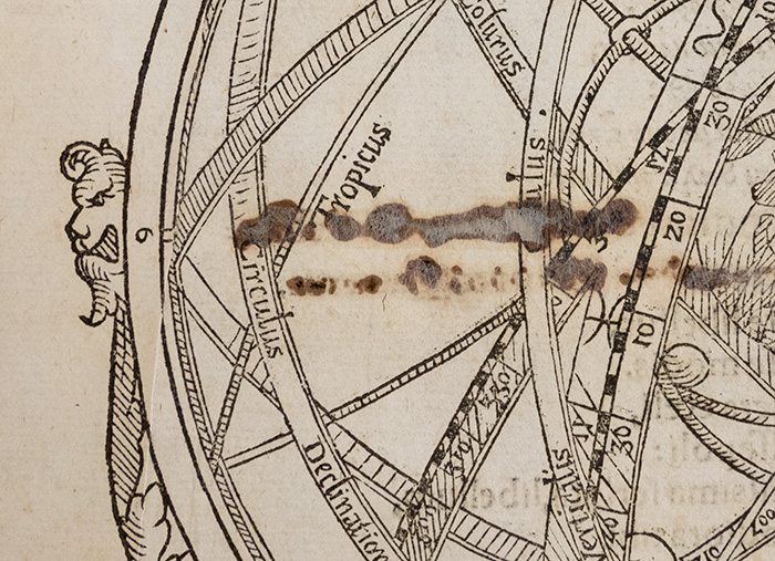 This copy of Primum mobile was typeset by hand, printed on high-quality rag paper, and bound in parchment. Despite being 450 years old, it barely shows its age. The title page displays an illustration of an armillary sphere—an ancient astronomical device that reproduces a model of the celestial sphere—with the Earth at its center, but there are several brown ink spots that mar the image. When you turn the page, it becomes evident that the book’s censor, blacking out some offending text, applied iron gall ink, a compound made of iron salts and tannic acids.