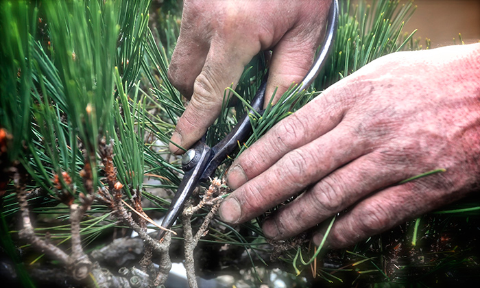 Take, for example, the Japanese black pine, Pinus thunbergii, a beautiful ornamental tree found throughout the Japanese Garden. Seen from a distance, a specimen leaning toward the bonsai court seemed pleasing. But, up close, you could see that tiny branches had started growing every which way, impeding air flow and shading lower branches. An American gardener might use a standard pruner to remove some larger branches and shorten others.