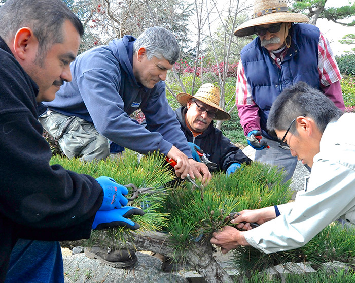 Members of The Huntington’s crew for Asian gardens join Fumitaka Hano for hands-on pruning lessons. Photo by Andrew Mitchell.
