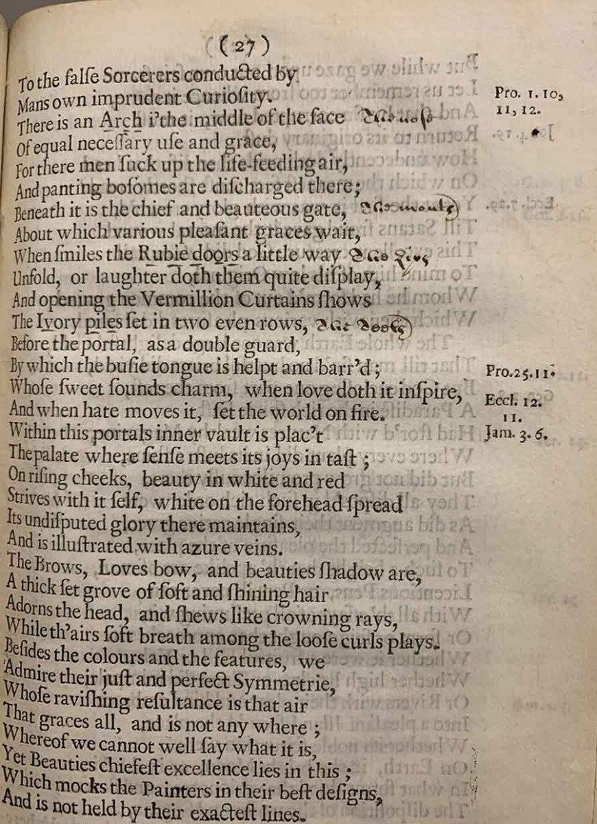 Early handwritten annotation on The Huntington’s copy of Lucy Hutchinson’s Order and Disorder. The annotation glosses metaphors in the poem as meaning “The nose,” “The mouth,” “The Lips,” “The Teeth.” The Huntington Library, Art Museum, and Botanical Gardens.