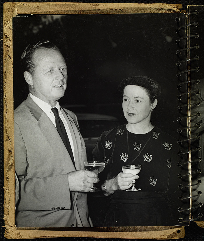 Millard Sheets and his wife, Mary Sheets, at a party related to the “Arts of Daily Living” exhibition at the Los Angeles County Fair in Pomona, 1954. Photo by Maynard L. Parker. The Huntington Library, Art Collections, and Botanical Gardens.