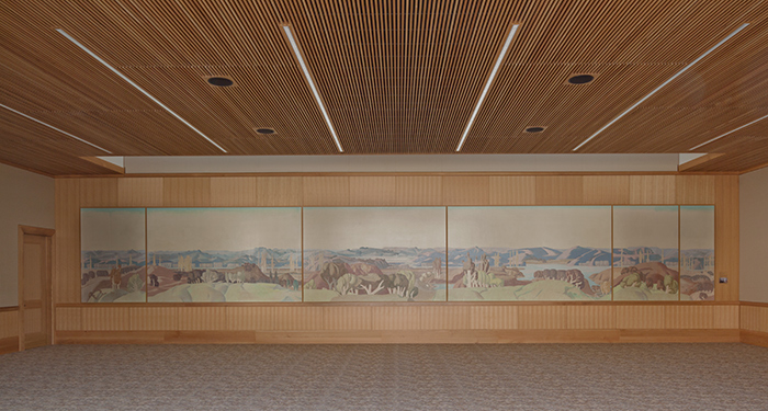 Mural for the Home of Fred H. and Bessie Ranke, 1934, by Millard Sheets. Gift of Larry McFarland and M. Todd Williamson. Depicting a bucolic California landscape of stylized hills and trees, the mural was painstakingly removed and conserved before being installed in the Stewart R. Smith Board Room at The Huntington. Photo by Tim Street-Porter. The Huntington Library, Art Collections, and Botanical Gardens.