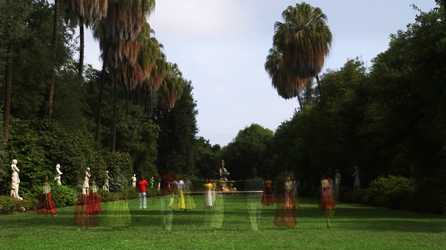 In her video, Apariciones / Apparitions (2018), Caycedo brings brown and black bodies to supernatural life, navigating The Huntington’s grounds in uncanny ways. The dancers in this still from the video appear to melt into the landscape of The Huntington’s North Vista. Apariciones / Apparitions was choreographed by Marina Magalhães and shot by David de Rozas. Courtesy of Carolina Caycedo.