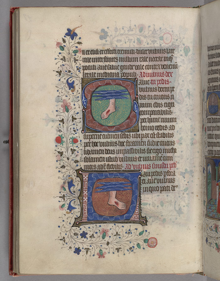 This set of prayers was written in Latin, putting its analogies beyond the reach of some readers. For them, a series of images that sometimes accompanied the prayers provided an intriguing visual translation. These miniature paintings, which appear in two of The Huntington’s books of hours, depict each wounded hand and foot separately, and juxtapose each with a minimalist representation of water. Visually arresting in their own right, they are even more powerful when considered in light of their symbolism, for they suggest not only an analogy, but also an anatomical connection between the flow of the four rivers of paradise and the flow of blood from Christ’s wounds, a connection that also intimates a passage to paradise through worship of the wounds.