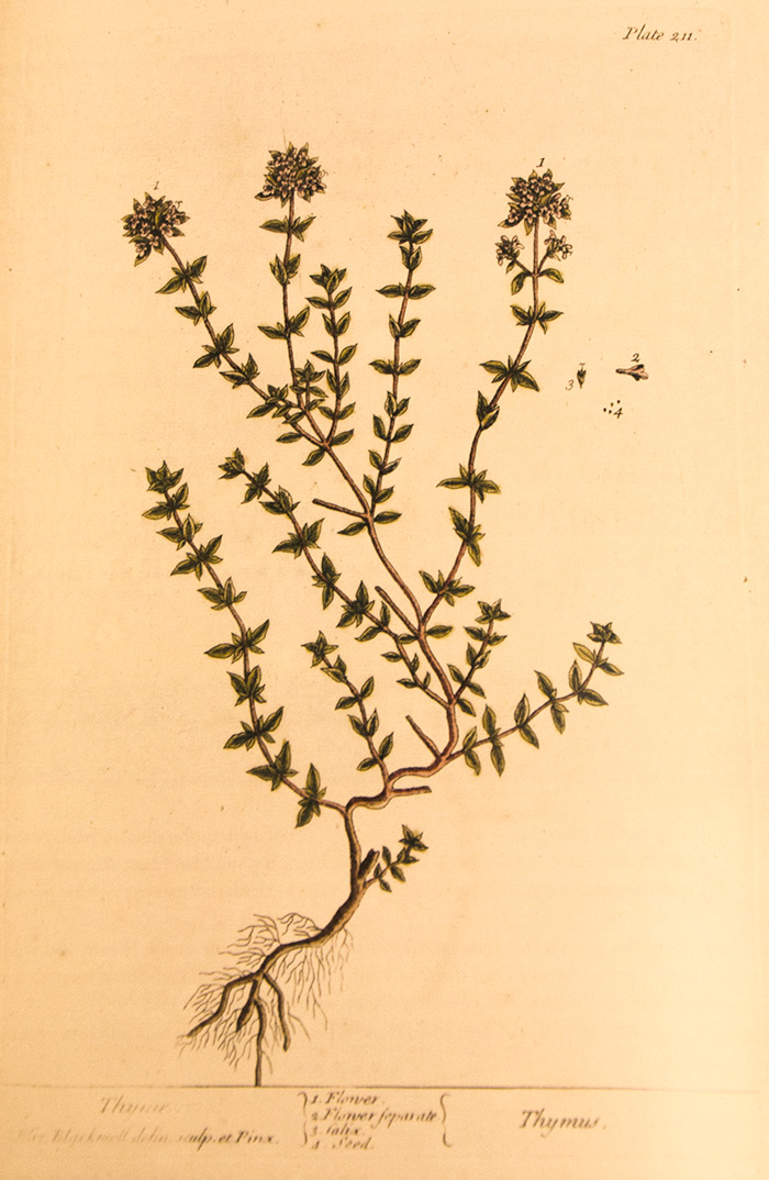 Reproductions from The Huntington's copy of Elizabeth Blackwell's 1737 botanical work, A Curious Herbal, are sprinkled among the recipes in A Celebration of Herbs. (Pictured: thyme.) Huntington Library Press.