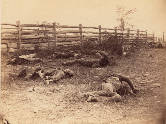 Also on view in “Remarkable Works” is this photograph by Alexander Gardner (1821–1882), "Confederate Soldiers, As they fell inside the fence on the Hagerstown Road, at the Battle of Antietam, September 1862," albumen print.