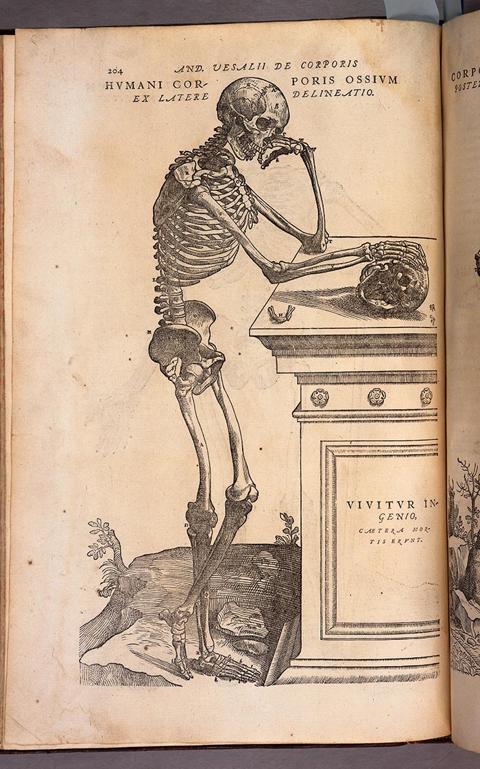 The text on the sarcophagus from this 1555 edition of De humani corporis fabrica reads “Vivitur ingenio, catera mortis erunt” (“Genius lives on, all else is mortal.”) The Huntington Library, Art Collections, and Botanical Gardens.