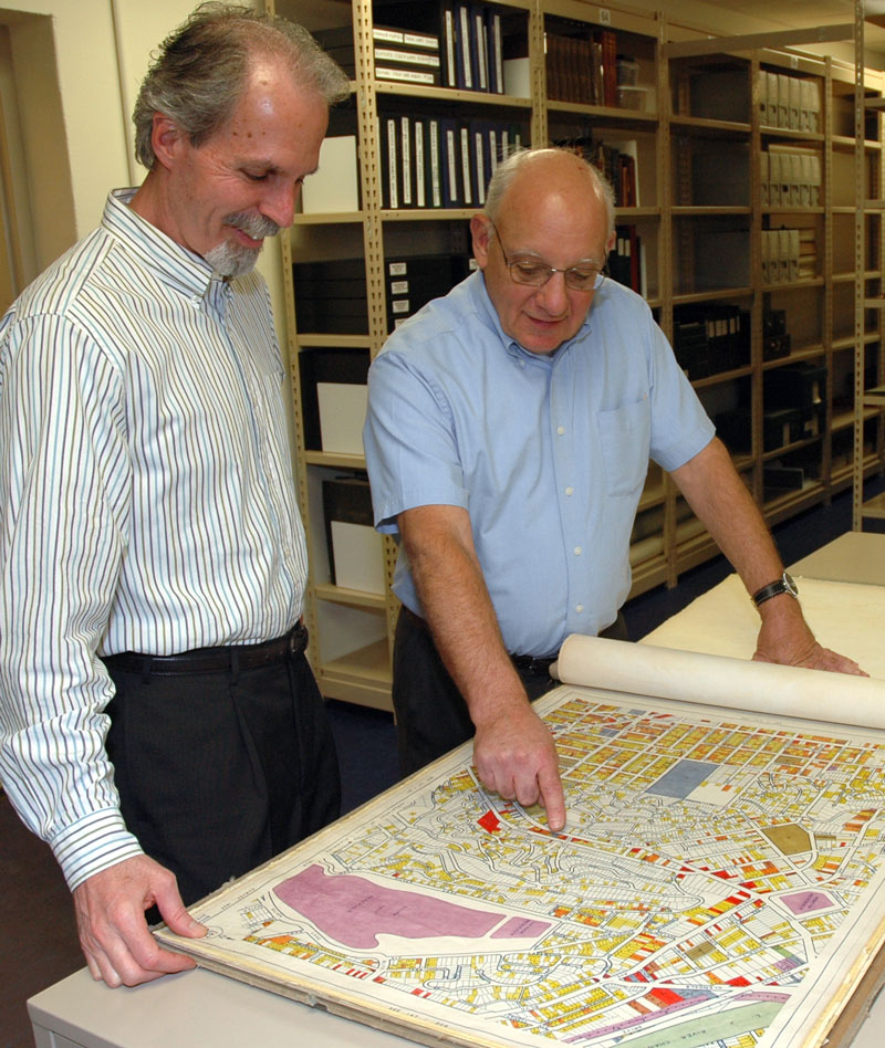 Alan Jutzi (right), chief curator of rare books, and colleague David Mihaly look at one of the L.A. city maps used by researchers developing the video game L.A. Noire. Photo by Lisa Blackburn.