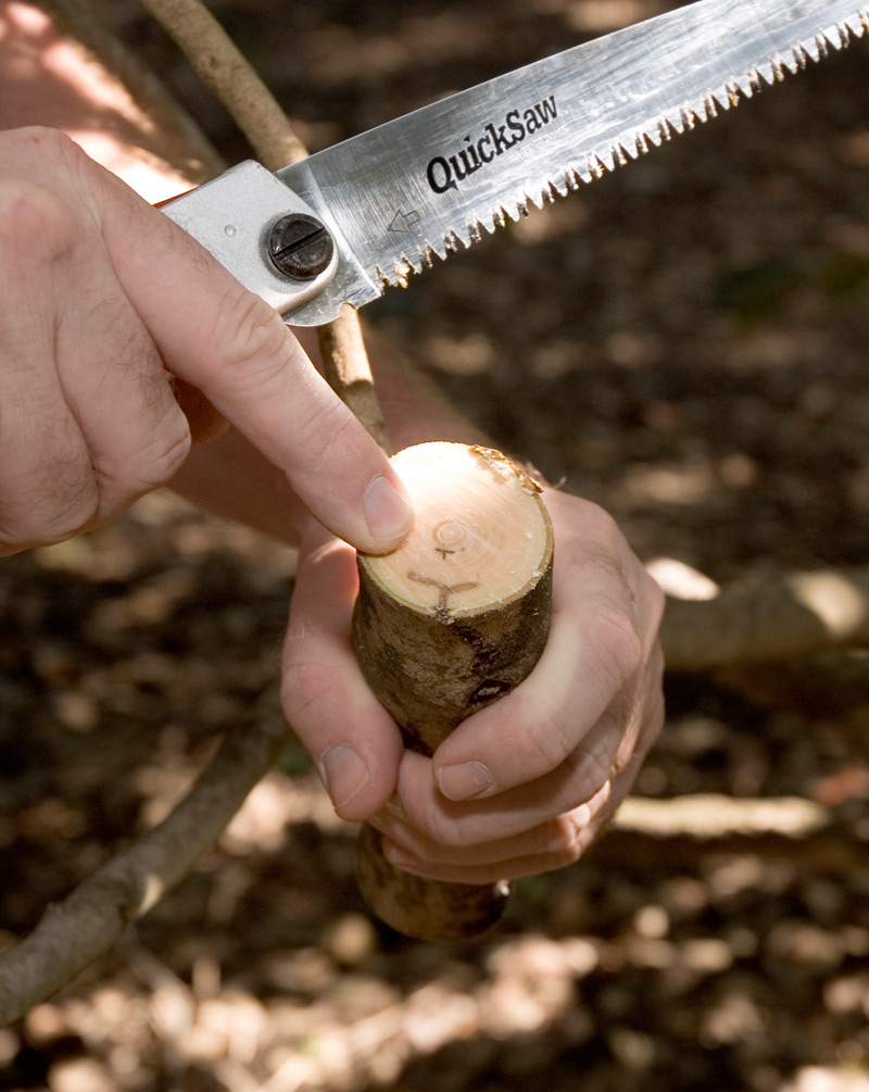 A cut branch shows two Y-shaped galleries created by the female beetle boring into the wood of the camellia branch. Photo by Lisa Blackburn.