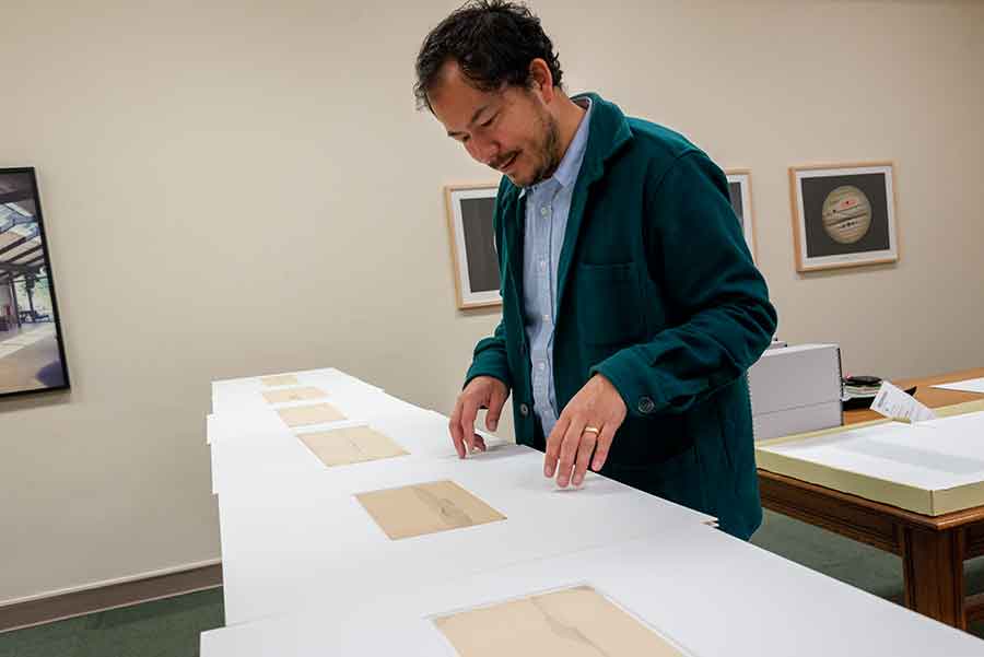Rosten Woo studies landscape drawings produced during an expedition led by John Russell Bartlett (1805–1886). Bartlett was hired in 1850 to survey the border between Mexico and the United States after the Mexican American War (1846–1848). Photo by Kate Lain.